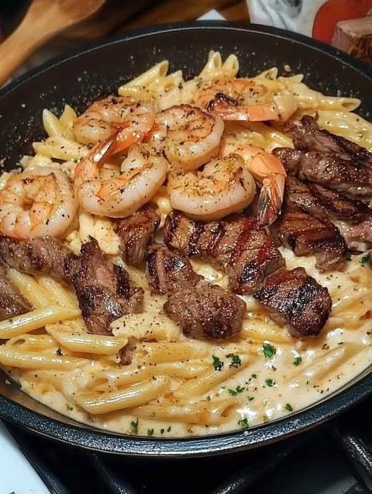 Creamy Garlic Parmesan Pasta with Steak & Shrimp
